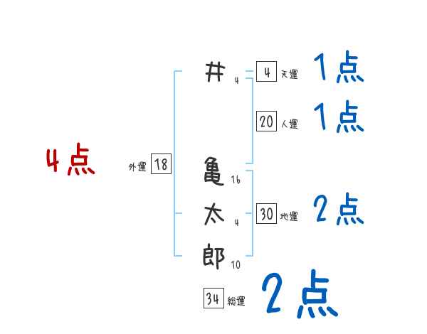 天運![]() | 井亀太郎さんの天運は4画の1つ星!感情が不安定で苦労するかも。周囲との協調を心掛けましょう。 家系が持つ宿命的な運勢を表します。祖先から受け継いだ苗字ですので自分の力が及びません。家柄を象徴します。 |