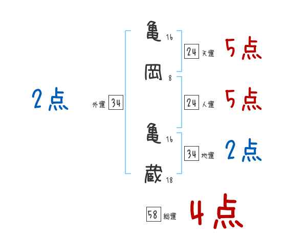 天運![]() | 亀岡亀蔵さんの天運は24画の5つ星!家庭運が良く順調な人生。金運にも恵まれる。 家系が持つ宿命的な運勢を表します。祖先から受け継いだ苗字ですので自分の力が及びません。家柄を象徴します。 |