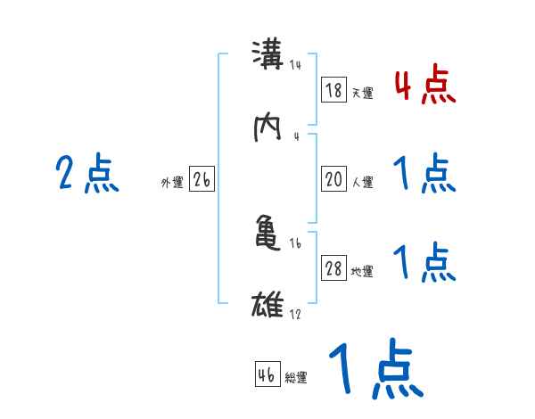 総運![]() | 溝内亀雄さんの総運は46画の1つ星!迷走することが多く苦労するかも。目先のことにとらわれないように。 あなたの人生を表す1番重要な運勢です。生涯を通じて影響する総合運となり、主に50歳以降の晩年期に影響を及ぼします。 |