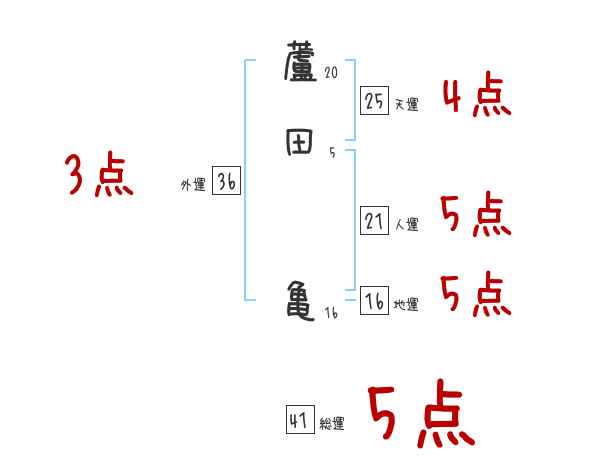 総運![]() | 蘆田亀さんの総運は41画の5つ星!大志を抱き、目標に向かって実力を発揮し達成する。温和な性格。 あなたの人生を表す1番重要な運勢です。生涯を通じて影響する総合運となり、主に50歳以降の晩年期に影響を及ぼします。 |