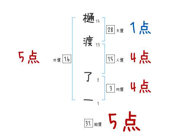 | 総運  | 樋渡了一さんの総運は31画の5つ星!社交性があり判断力に優れる。順風満帆な人生で円満な生活。あなたの人生を表す1番重要な運勢です。生涯を通じて影響する総合運となり、主に50歳以降の晩年期に影響を及ぼします。 |