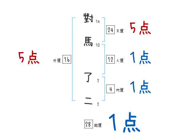 外運![]() | 對馬了二さんの外運は16画の5つ星!人望が厚く大きく発展する。逆転成功が見える。 生活面を象徴する運勢です。外部から受ける影響力を表し、結婚運、家庭運や職場、環境への順応性を表します。 |