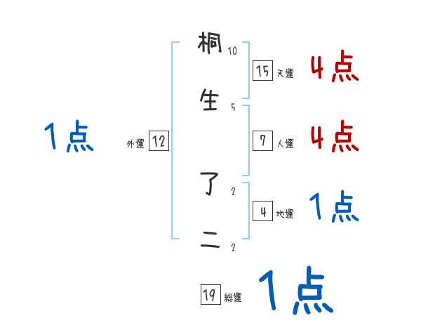 天運![]() | 桐生了二さんの天運は15画の4つ星!人徳があり出世する。順調に物事を進め円満な人生。 家系が持つ宿命的な運勢を表します。祖先から受け継いだ苗字ですので自分の力が及びません。家柄を象徴します。 |