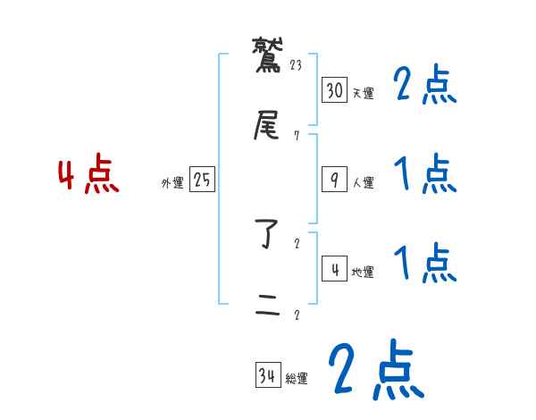 天運![]() | 鷲尾了二さんの天運は30画の2つ星!浮き沈みの激しさに注意しましょう。 家系が持つ宿命的な運勢を表します。祖先から受け継いだ苗字ですので自分の力が及びません。家柄を象徴します。 |