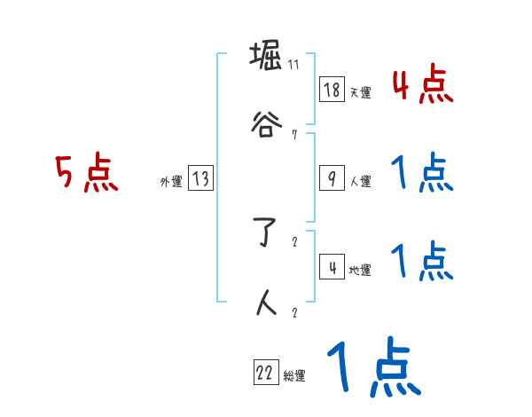 天運![]() | 堀谷了人さんの天運は18画の4つ星!情熱的で剛気。忍耐力があり信頼される。 家系が持つ宿命的な運勢を表します。祖先から受け継いだ苗字ですので自分の力が及びません。家柄を象徴します。 |