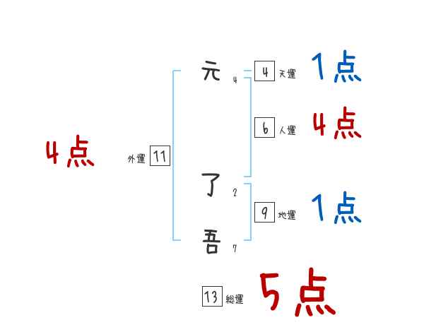 天運![]() | 元了吾さんの天運は4画の1つ星!感情が不安定で苦労するかも。周囲との協調を心掛けましょう。 家系が持つ宿命的な運勢を表します。祖先から受け継いだ苗字ですので自分の力が及びません。家柄を象徴します。 |