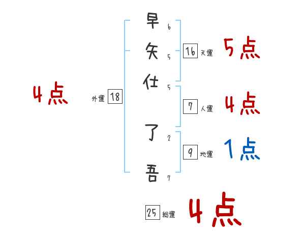 天運![]() | 早矢仕了吾さんの天運は16画の5つ星!人望が厚く大きく発展する。逆転成功が見える。 家系が持つ宿命的な運勢を表します。祖先から受け継いだ苗字ですので自分の力が及びません。家柄を象徴します。 |