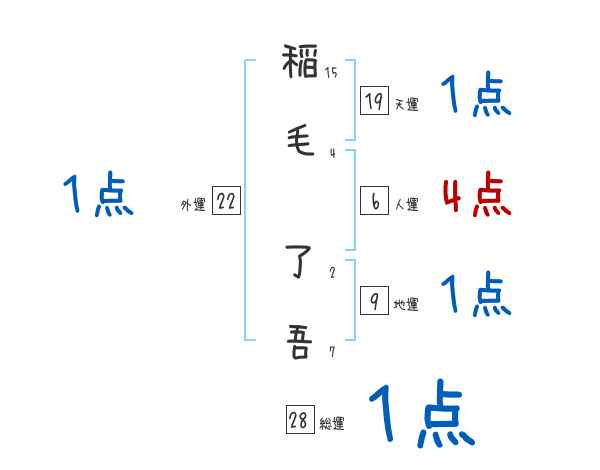 天運![]() | 稲毛了吾さんの天運は19画の1つ星!優れた才能を持ちますが、協調性が足りないことも。周りの人と協力する事を意識しましょう。 家系が持つ宿命的な運勢を表します。祖先から受け継いだ苗字ですので自分の力が及びません。家柄を象徴します。 |