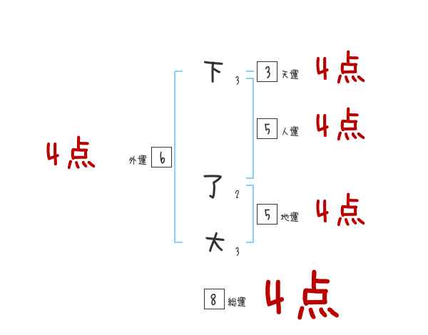 天運![]() | 下了大さんの天運は3画の4つ星!活動的で才能に恵まれ、多くの信頼を得る。希望に満ち成長する。 家系が持つ宿命的な運勢を表します。祖先から受け継いだ苗字ですので自分の力が及びません。家柄を象徴します。 |