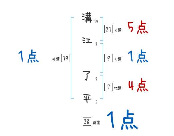 天運![]() | 溝江了平さんの天運は21画の5つ星!統率力がある。独立し成功する。名誉を手に入れる。 家系が持つ宿命的な運勢を表します。祖先から受け継いだ苗字ですので自分の力が及びません。家柄を象徴します。 |