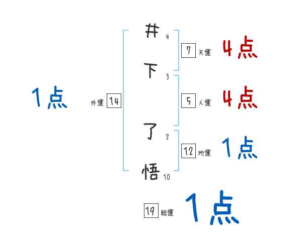 外運![]() | 井下了悟さんの外運は14画の1つ星!人に対して優しいがストレスを溜め込みがち。人間関係のトラブルを避けるよう気をつけましょう。 生活面を象徴する運勢です。外部から受ける影響力を表し、結婚運、家庭運や職場、環境への順応性を表します。 |