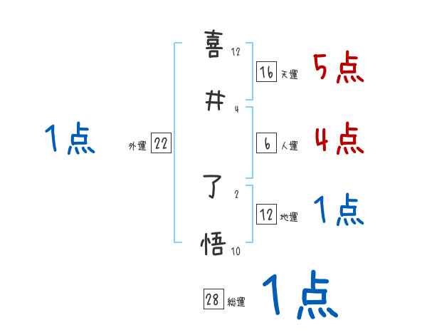 外運![]() | 喜井了悟さんの外運は22画の1つ星!努力することが苦手ないっぽう手先が器用。芸術性にも優れる。 生活面を象徴する運勢です。外部から受ける影響力を表し、結婚運、家庭運や職場、環境への順応性を表します。 |