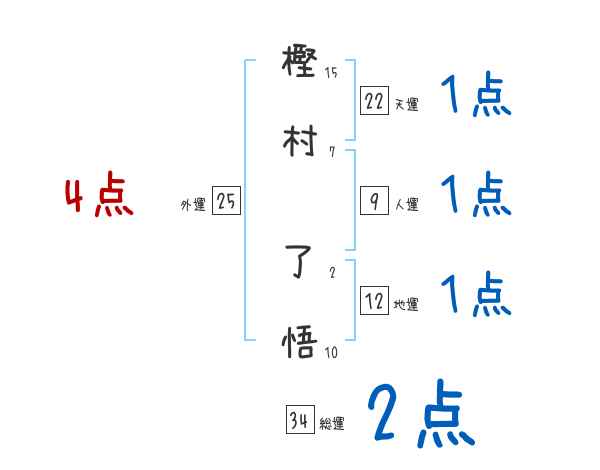 総運![]() | 樫村了悟さんの総運は34画の2つ星!独創性に優れるが、自尊心が強く災難に注意しましょう。 あなたの人生を表す1番重要な運勢です。生涯を通じて影響する総合運となり、主に50歳以降の晩年期に影響を及ぼします。 |