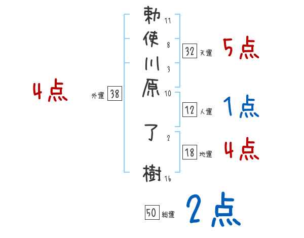 総運![]() | 勅使川原了樹さんの総運は50画の2つ星!浮き沈みが激しく不安定。しりすぼみに衰退しやすいので注意しましょう。 あなたの人生を表す1番重要な運勢です。生涯を通じて影響する総合運となり、主に50歳以降の晩年期に影響を及ぼします。 |