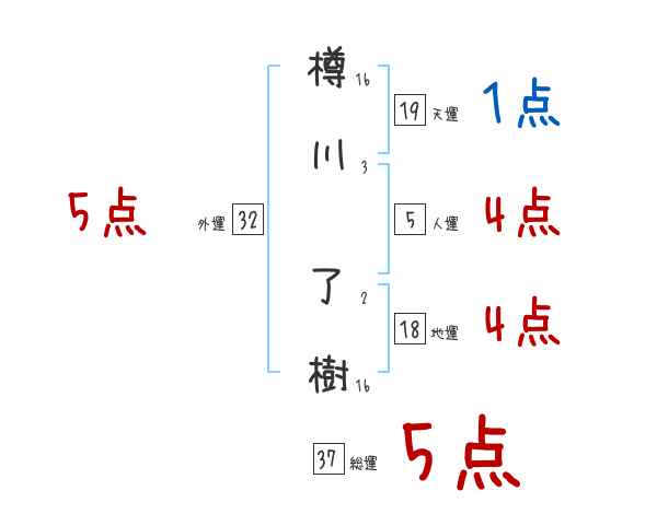 外運![]() | 樽川了樹さんの外運は32画の5つ星!柔軟性があり成功する。チャンスが多く金運が良い。 生活面を象徴する運勢です。外部から受ける影響力を表し、結婚運、家庭運や職場、環境への順応性を表します。 |