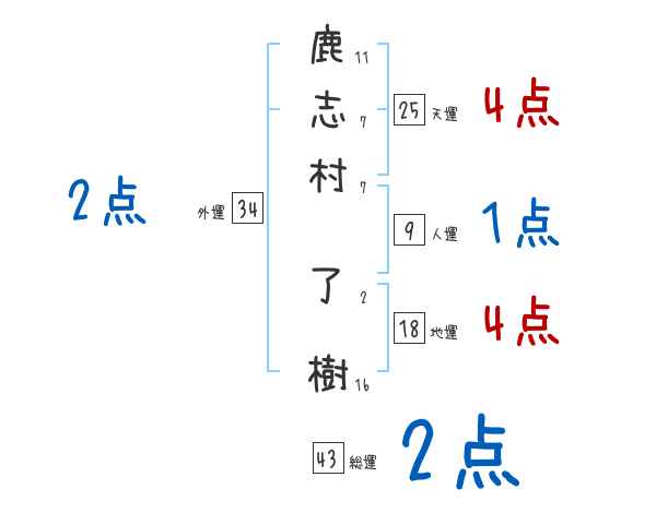 総運![]() | 鹿志村了樹さんの総運は43画の2つ星!頑固な性格で独立心が強いかも。やや非現実的で浪費に注意しましょう。 あなたの人生を表す1番重要な運勢です。生涯を通じて影響する総合運となり、主に50歳以降の晩年期に影響を及ぼします。 |