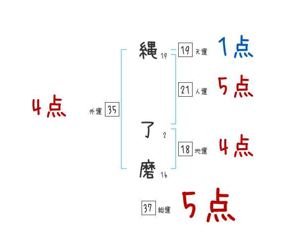 天運![]() | 縄了磨さんの天運は19画の1つ星!優れた才能を持ちますが、協調性が足りないことも。周りの人と協力する事を意識しましょう。 家系が持つ宿命的な運勢を表します。祖先から受け継いだ苗字ですので自分の力が及びません。家柄を象徴します。 |