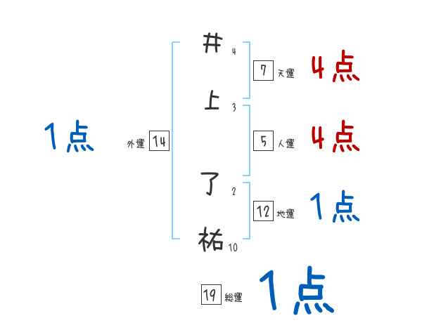 天運![]() | 井上了祐さんの天運は7画の4つ星!強い意志や信念を持ち独立心が強い。自立する。 家系が持つ宿命的な運勢を表します。祖先から受け継いだ苗字ですので自分の力が及びません。家柄を象徴します。 |