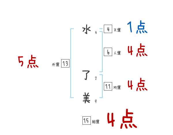 天運![]() | 水了美さんの天運は4画の1つ星!感情が不安定で苦労するかも。周囲との協調を心掛けましょう。 家系が持つ宿命的な運勢を表します。祖先から受け継いだ苗字ですので自分の力が及びません。家柄を象徴します。 |