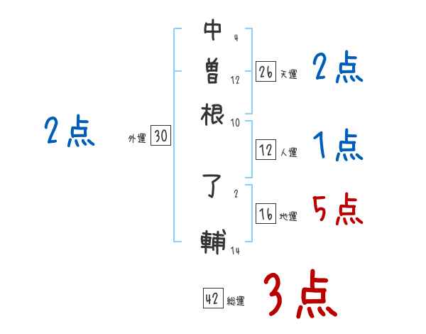 外運![]() | 中曽根了輔さんの外運は30画の2つ星!浮き沈みの激しさに注意しましょう。 生活面を象徴する運勢です。外部から受ける影響力を表し、結婚運、家庭運や職場、環境への順応性を表します。 |
