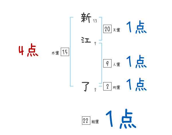 総運![]() | 新江了さんの総運は22画の1つ星!努力することが苦手ないっぽう手先が器用。芸術性にも優れる。 あなたの人生を表す1番重要な運勢です。生涯を通じて影響する総合運となり、主に50歳以降の晩年期に影響を及ぼします。 |
