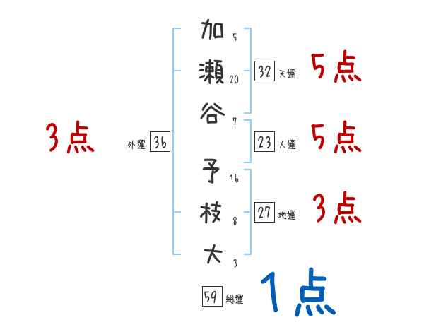 天運![]() | 加瀬谷予枝大さんの天運は32画の5つ星!柔軟性があり成功する。チャンスが多く金運が良い。 家系が持つ宿命的な運勢を表します。祖先から受け継いだ苗字ですので自分の力が及びません。家柄を象徴します。 |