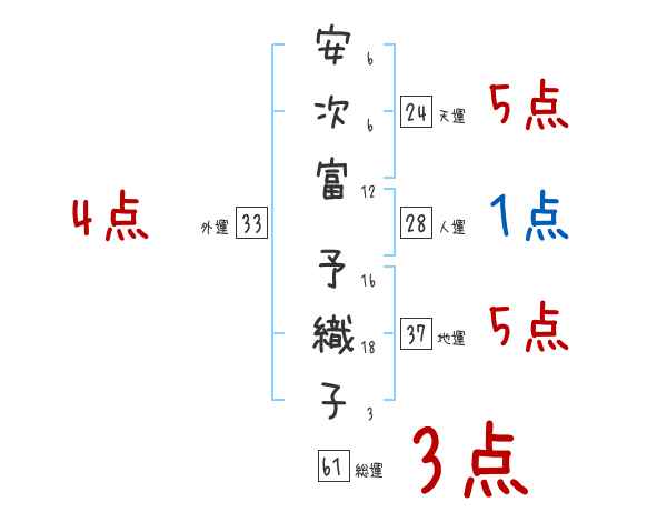 天運![]() | 安次富予織子さんの天運は24画の5つ星!家庭運が良く順調な人生。金運にも恵まれる。 家系が持つ宿命的な運勢を表します。祖先から受け継いだ苗字ですので自分の力が及びません。家柄を象徴します。 |