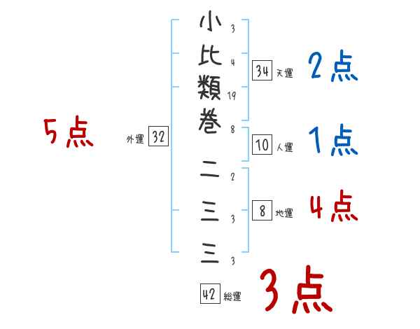 外運![]() | 小比類巻二三三さんの外運は32画の5つ星!柔軟性があり成功する。チャンスが多く金運が良い。 生活面を象徴する運勢です。外部から受ける影響力を表し、結婚運、家庭運や職場、環境への順応性を表します。 |