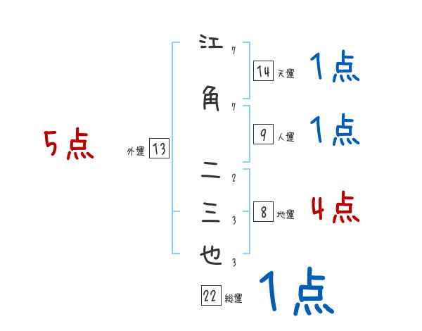 外運![]() | 江角二三也さんの外運は13画の5つ星!才能に恵まれ人気がある。名声を手に入れる。円満な人生。 生活面を象徴する運勢です。外部から受ける影響力を表し、結婚運、家庭運や職場、環境への順応性を表します。 |