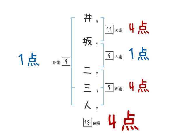 天運![]() | 井坂二三人さんの天運は11画の4つ星!着実に富や地位を得る幸運な人生。 家系が持つ宿命的な運勢を表します。祖先から受け継いだ苗字ですので自分の力が及びません。家柄を象徴します。 |