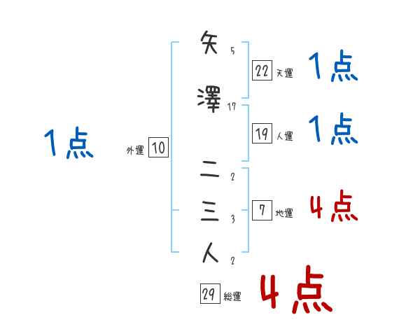 天運![]() | 矢澤二三人さんの天運は22画の1つ星!努力することが苦手ないっぽう手先が器用。芸術性にも優れる。 家系が持つ宿命的な運勢を表します。祖先から受け継いだ苗字ですので自分の力が及びません。家柄を象徴します。 |