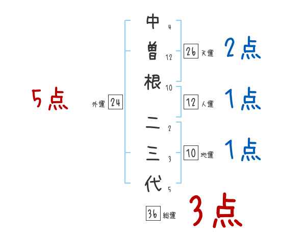 総運![]() | 中曽根二三代さんの総運は36画の3つ星!先見性が豊かです。多少神経質で苦労することも。 あなたの人生を表す1番重要な運勢です。生涯を通じて影響する総合運となり、主に50歳以降の晩年期に影響を及ぼします。 |