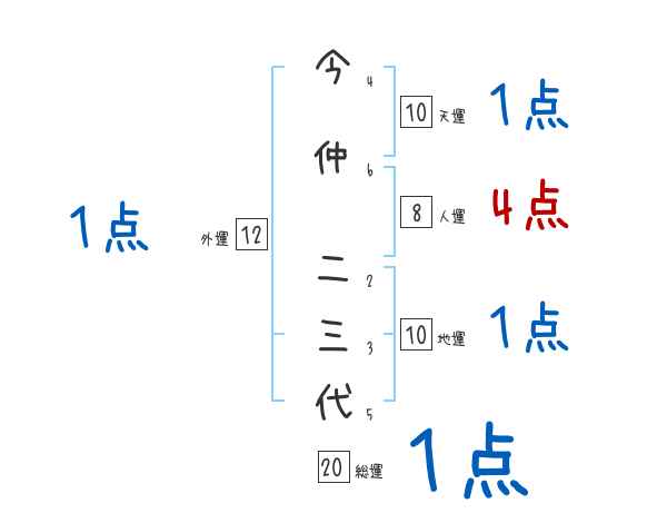 天運![]() | 今仲二三代さんの天運は10画の1つ星!不安を感じやすい傾向。ストレスを抱えないように注意しましょう。 家系が持つ宿命的な運勢を表します。祖先から受け継いだ苗字ですので自分の力が及びません。家柄を象徴します。 |