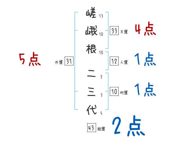 総運![]() | 嵯峨根二三代さんの総運は43画の2つ星!頑固な性格で独立心が強いかも。やや非現実的で浪費に注意しましょう。 あなたの人生を表す1番重要な運勢です。生涯を通じて影響する総合運となり、主に50歳以降の晩年期に影響を及ぼします。 |