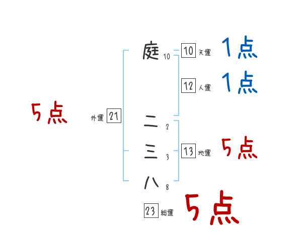 天運![]() | 庭二三八さんの天運は10画の1つ星!不安を感じやすい傾向。ストレスを抱えないように注意しましょう。 家系が持つ宿命的な運勢を表します。祖先から受け継いだ苗字ですので自分の力が及びません。家柄を象徴します。 |