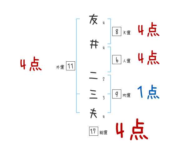総運![]() | 友井二三夫さんの総運は17画の4つ星!積極的な行動力。地位を気づき財産を手に入れる。純粋な心と直感力。 あなたの人生を表す1番重要な運勢です。生涯を通じて影響する総合運となり、主に50歳以降の晩年期に影響を及ぼします。 |