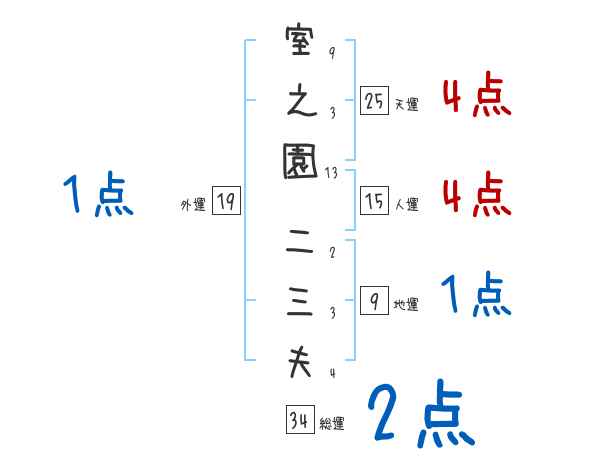 外運![]() | 室之園二三夫さんの外運は19画の1つ星!優れた才能を持ちますが、協調性が足りないことも。周りの人と協力する事を意識しましょう。 生活面を象徴する運勢です。外部から受ける影響力を表し、結婚運、家庭運や職場、環境への順応性を表します。 |
