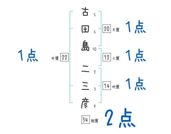 外運![]() | 古田島二三彦さんの外運は22画の1つ星!努力することが苦手ないっぽう手先が器用。芸術性にも優れる。 生活面を象徴する運勢です。外部から受ける影響力を表し、結婚運、家庭運や職場、環境への順応性を表します。 |