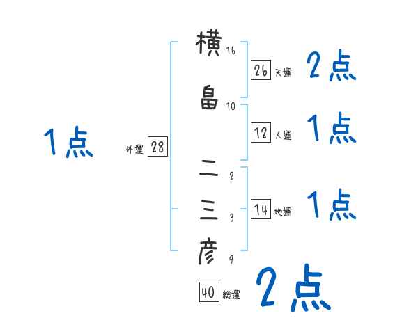 天運![]() | 横畠二三彦さんの天運は26画の2つ星!波瀾万丈かも。信頼できる人を大事にしましょう。 家系が持つ宿命的な運勢を表します。祖先から受け継いだ苗字ですので自分の力が及びません。家柄を象徴します。 |