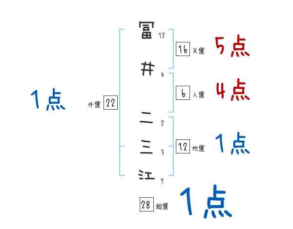 天運![]() | 冨井二三江さんの天運は16画の5つ星!人望が厚く大きく発展する。逆転成功が見える。 家系が持つ宿命的な運勢を表します。祖先から受け継いだ苗字ですので自分の力が及びません。家柄を象徴します。 |