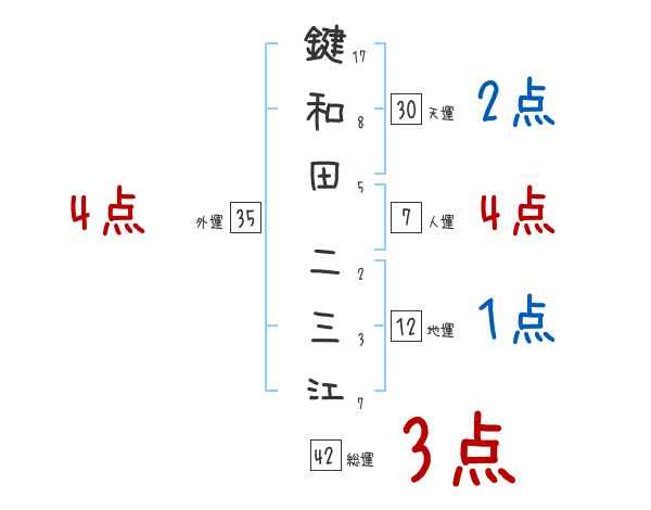 外運![]() | 鍵和田二三江さんの外運は35画の4つ星!温厚な性格で感受性が高い。穏和な性格で人望が厚い。 生活面を象徴する運勢です。外部から受ける影響力を表し、結婚運、家庭運や職場、環境への順応性を表します。 |