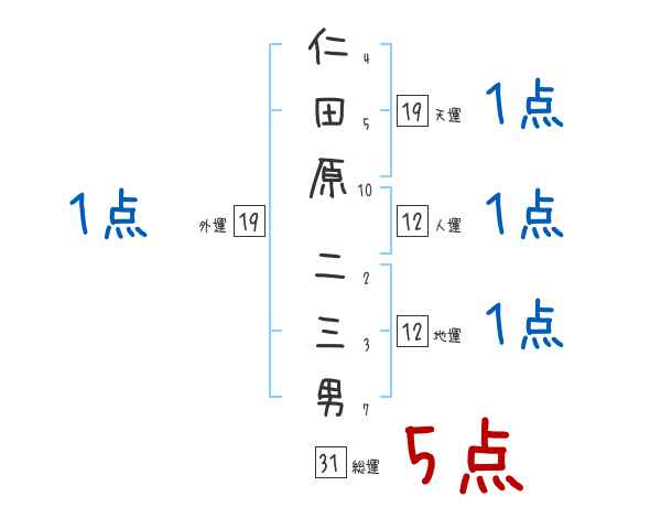 外運![]() | 仁田原二三男さんの外運は19画の1つ星!優れた才能を持ちますが、協調性が足りないことも。周りの人と協力する事を意識しましょう。 生活面を象徴する運勢です。外部から受ける影響力を表し、結婚運、家庭運や職場、環境への順応性を表します。 |