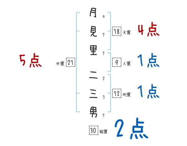 天運![]() | 月見里二三男さんの天運は18画の4つ星!情熱的で剛気。忍耐力があり信頼される。 家系が持つ宿命的な運勢を表します。祖先から受け継いだ苗字ですので自分の力が及びません。家柄を象徴します。 |