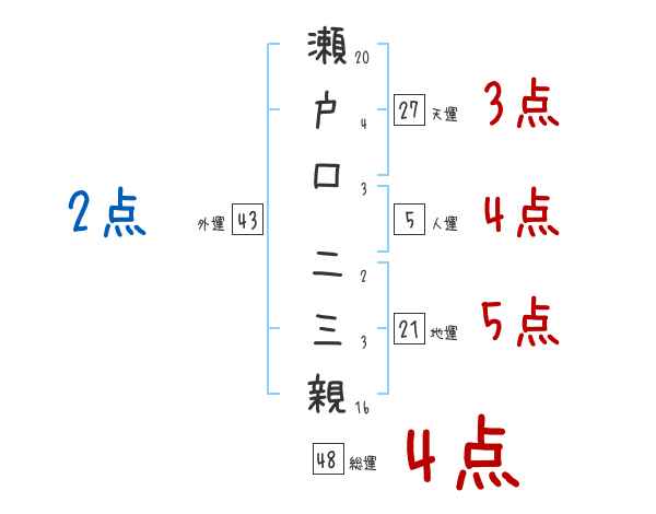 天運![]() | 瀬戸口二三親さんの天運は27画の3つ星!頭脳明晰だが強情で摩擦が多い傾向。孤立に注意。 家系が持つ宿命的な運勢を表します。祖先から受け継いだ苗字ですので自分の力が及びません。家柄を象徴します。 |
