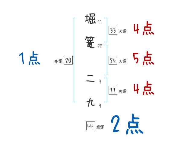 天運![]() | 堀篭二九さんの天運は33画の4つ星!権力志向でプライドが高い。勇気があり運を切り開き成功する。 家系が持つ宿命的な運勢を表します。祖先から受け継いだ苗字ですので自分の力が及びません。家柄を象徴します。 |