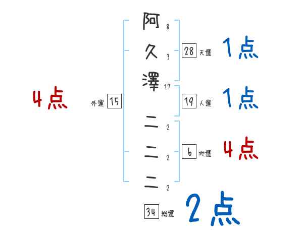 天運![]() | 阿久澤二二二さんの天運は28画の1つ星!家庭環境に注意。スポーツで活躍できる能力があるかも。 家系が持つ宿命的な運勢を表します。祖先から受け継いだ苗字ですので自分の力が及びません。家柄を象徴します。 |