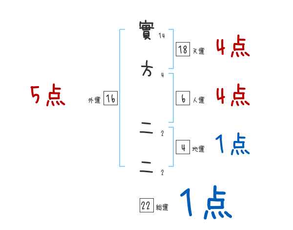 天運![]() | 實方二二さんの天運は18画の4つ星!情熱的で剛気。忍耐力があり信頼される。 家系が持つ宿命的な運勢を表します。祖先から受け継いだ苗字ですので自分の力が及びません。家柄を象徴します。 |