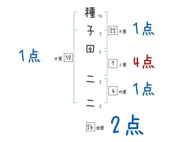 外運![]() | 種子田二二さんの外運は19画の1つ星!優れた才能を持ちますが、協調性が足りないことも。周りの人と協力する事を意識しましょう。 生活面を象徴する運勢です。外部から受ける影響力を表し、結婚運、家庭運や職場、環境への順応性を表します。 |