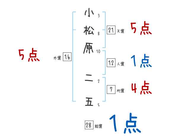 総運![]() | 小松原二五さんの総運は28画の1つ星!家庭環境に注意。スポーツで活躍できる能力があるかも。 あなたの人生を表す1番重要な運勢です。生涯を通じて影響する総合運となり、主に50歳以降の晩年期に影響を及ぼします。 |