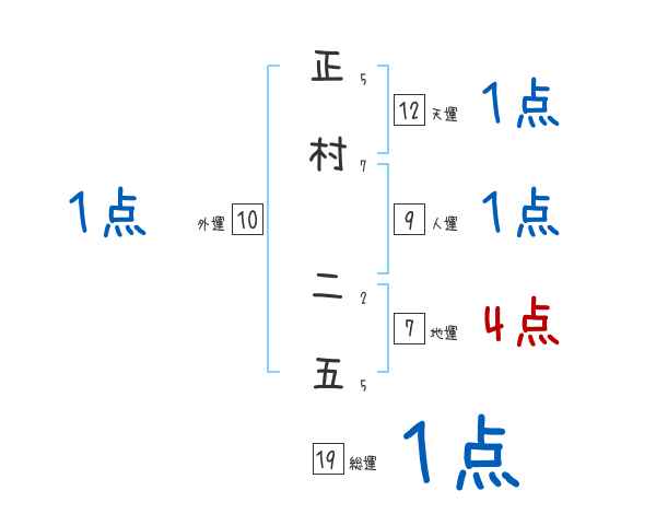 天運![]() | 正村二五さんの天運は12画の1つ星!簡単な失敗で諦めてしまいやすいかも。着実に行動すると良いでしょう。 家系が持つ宿命的な運勢を表します。祖先から受け継いだ苗字ですので自分の力が及びません。家柄を象徴します。 |